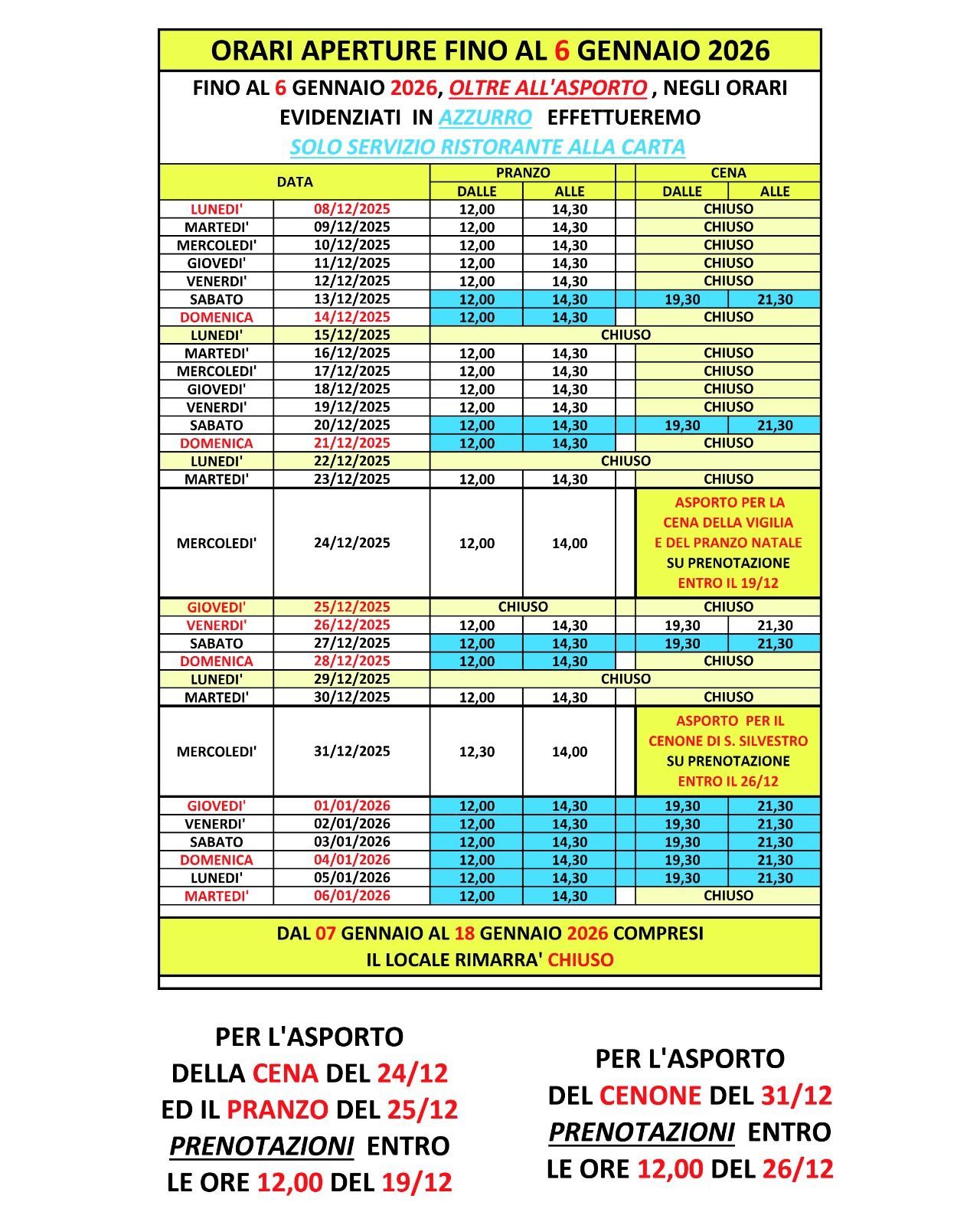 Aperti dal lunedì al sabato dalle 12:00 alle 14:30. Domenica chiuso. Nei giorni festivi vi invitiamo a contattarci per verificare eventuali aperture.