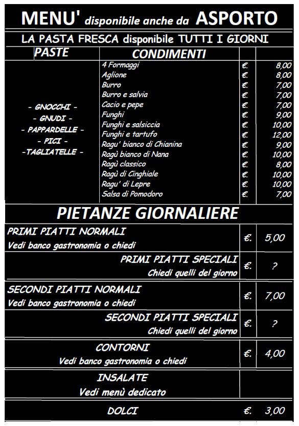 Da noi ogni giorno trovi piatti freschi, genuini e preparati con passione. Dalla pasta fatta in casa ai secondi piatti e ai dolci, offriamo una varietà di specialità del territorio e proposte del giorno, tutte disponibili anche da asporto.