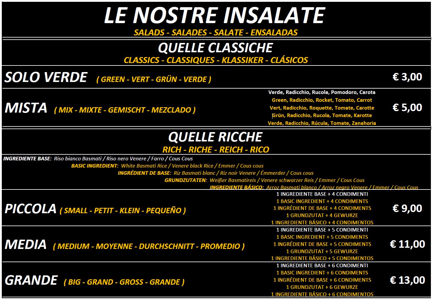 Accanto ai nostri piatti giornalieri, ti proponiamo un menu dedicato alle insalate, dalle classiche alle più ricche e sfiziose, perfette per un pasto leggero, gustoso e sempre fresco.